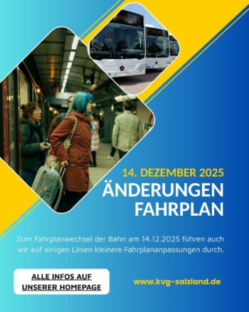Zum Fahrplanwechsel der Bahn am 14.12.2025 treten kleinere Fahrplananpassungen in Kraft. Änderungen gibt es auf den Linien 110, 111, 116, 117, 119, 120, 121, 122, 125, 132, 133, 137, 143, 147 und 157. Die geänderten Fahrpläne können HIER eingesehen werden.